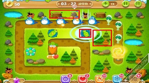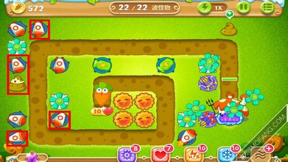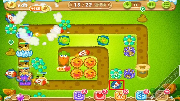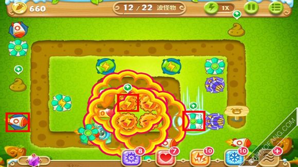 大量建造火箭塔(不超过8个),便便塔升满级(更好的减速)