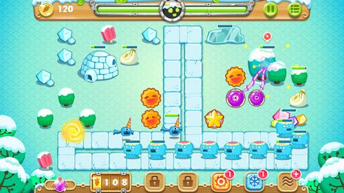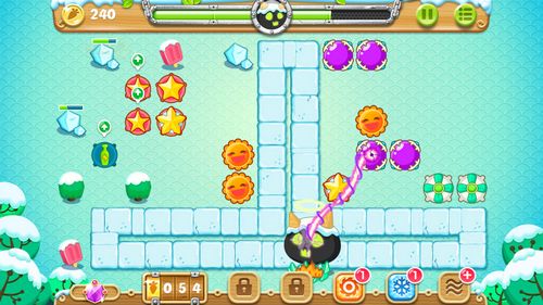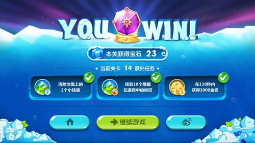 有了金币后就可以把风扇和魔法球都升级。接着左边的障碍物也被清除掉,会出现4个隐藏的炸弹星星。先升级两个炸弹星星把旁边的剩下的冰块迅速消灭。