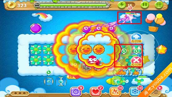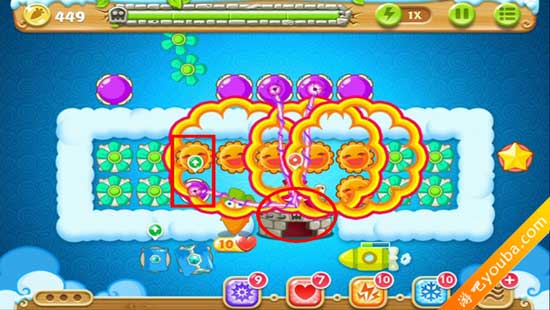 1、如下图,分别在左右侧放置一个水晶球和一个炸弹星。水晶球清理道具,炸弹星清怪。