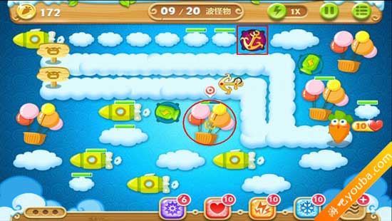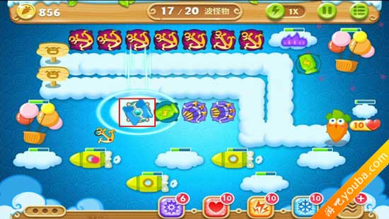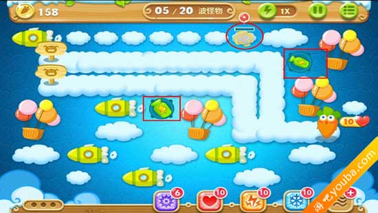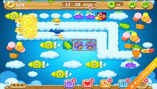 1、如图,放置瓶子炮塔并升级,攻击上方的云朵。