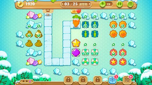 然后我们先清除左边的冰棍道具,冰棍清除之后把魔法塔升级到顶级。冰棍打掉后会出现隐藏的魔法塔,便便。