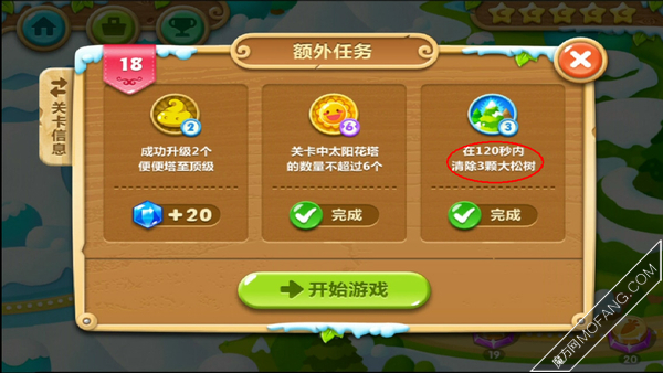 冰川18关,居然是继续额外任务,消灭3颗大松树。