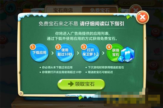 点击进入宝石商店,选择【免费宝石】就会弹出下图的窗口。从图中我们可以知道,下载其他游戏或应用,并且使用超过10秒,然后再进入保卫萝卜2就可以领取免费宝石了。