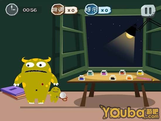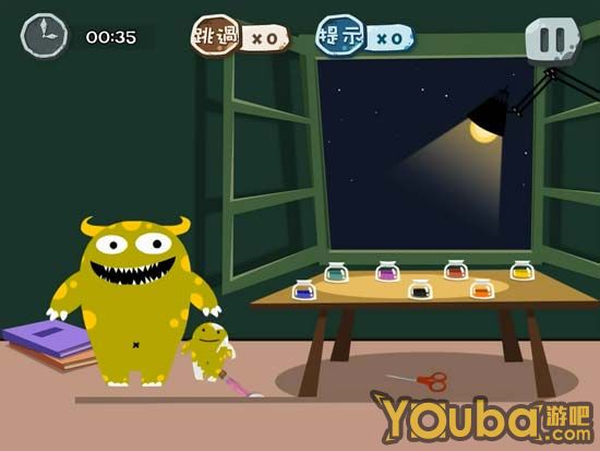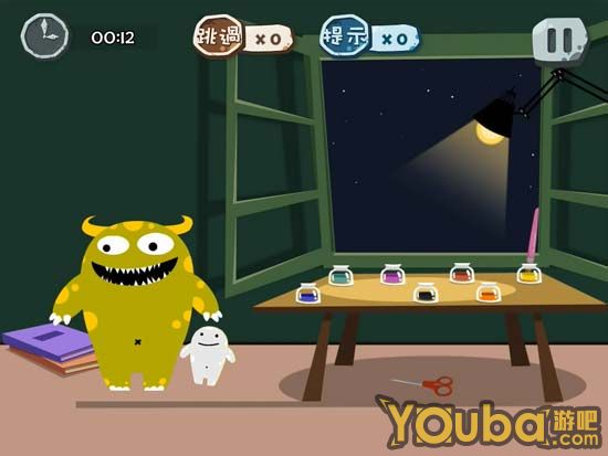 3、最后拖动地上的剪刀去戳布娃娃,小绿怪就会受伤了。