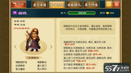 3、明教教众乍看之下似乎防御无用,但却不可忽略四法王的小缘分+63%武力,并且右使、鹰王、蝠王都是乙级弟子中的小极品,适用于小R到中R的玩家作为后期阵容培养,垃圾左使、龙王?丢小伙伴就好啦~