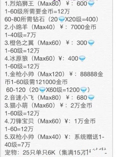 金枪小帅:120级 售价88888金币 1-60级121000金币 60-120级 1200钻石