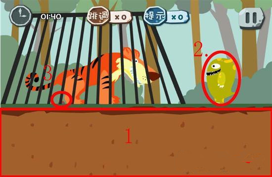 通关攻略:1.将画面中下方的绿色涂掉。2.点击小怪兽向老虎打招呼。3.在老虎起身后屁股下面会有一个红色的按钮我们点击它,这样老虎和小怪兽就会到地下,小怪兽就被吃掉了。