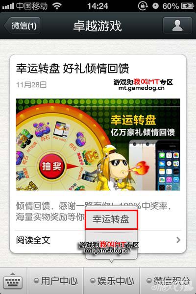 首先,还要要关注官方微信,具体的方法小编就不多说了,关注之后如下图选择娱乐中心就可以看到幸运转盘活动了。
