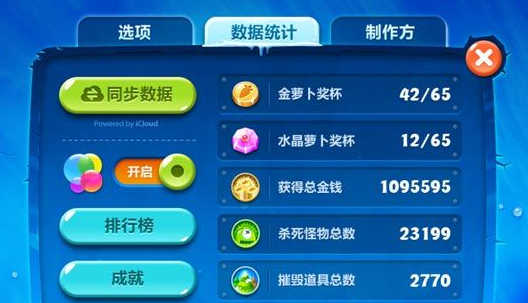 3、进入保卫萝卜2的【设置】—【数据统计】,点击【同步数据】即可;