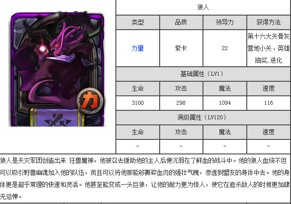 全民英雄中的狼人是否值得培养?相信很多玩家都有这个疑问,是自己抽到的第一张紫卡扔了觉得可惜,培养不知道它是否有价值,那就先来一起看看狼人的相关介绍。