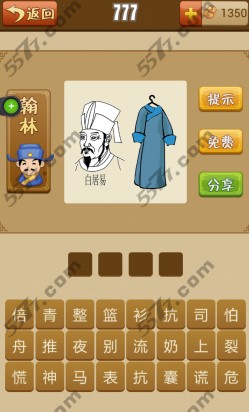 疯狂猜成语部分关卡难度很大,这里分享疯狂猜成语中部分难度关卡答案。图片为一个白色的白居易头像,旁边有一剑青色长衫是什么成语!