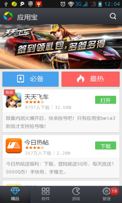 头版头条就是天天飞车的下载,由于小编是已经下载过天天飞车了,各位只需要根据应用宝的提示就可以进行操作啦!