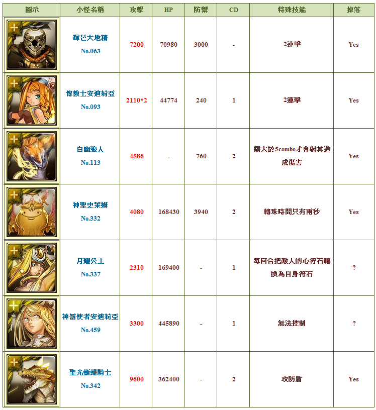第七封的光关【鹰扬神殿】建议卡片等级都练好了再来通关,因为七封的关卡每一关都类似Extra一样,不是简简单单就能通关的,每一只小怪都有特殊技能,下面表格有整理好会出现的小怪和伤害还有技能,进关卡前不妨来这里看看。