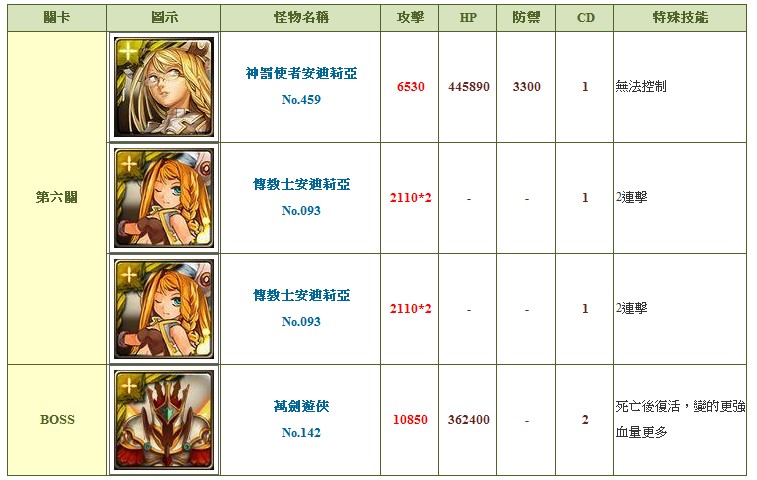 1、血量需大于13000以上比较保险,由于第六关有神罚使者安迪莉亚CD1而攻击有6530,所以如果可以的话几乎每一回合都要补血喔,回复不能太低,血量也是。