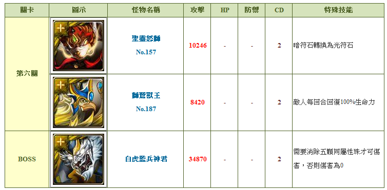 2、第六关的圣灵怒狮会将暗符石转为光符石对岸对来说这边要非常注意,狮鹫兽王会回血所以建议这一关开爆发直接2回合过关。