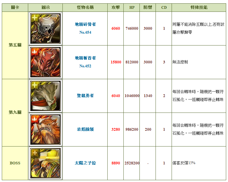 3、第九关要特别注意有两只怪物技能都是「每回合转珠时,随机把一颗符石风化,一经触碰即停止转珠」,经风化过后的符石就不可以再动到它了,可以消除但是不可以动到。