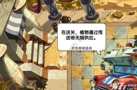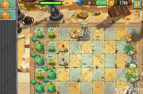 在埃及特殊关卡第一关中,我们将以传送带的形式来攻击僵尸,而传送带是无限供应植物的。