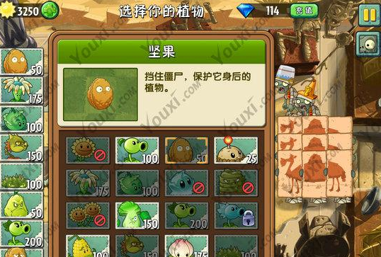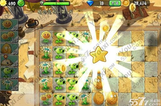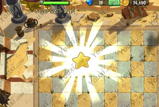 在植物大战僵尸2埃及坚不可摧第一天中,系统给予了我们3250阳光,2个能量豆。