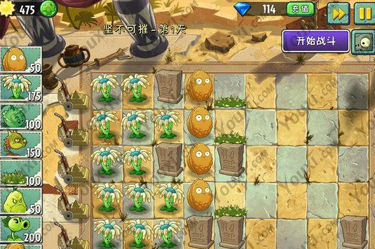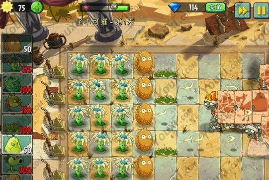 当坚果放满好,植物也差不多全部摆好了,而植物大家可以按照自己的喜好来放置。在最后期大家可以把最后排的植物全部产出用来种上卷心菜或者豌豆射手来加大攻击,因为在最后会出现很多的法老僵尸,非常耐打,没有强力的攻击力是不行的。
