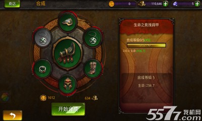 这时在界面上能够看到升级需要的经验,目前材料提供的经验和消耗的金钱,强化后的效果,以及最高的合成等级。点击开始合成装备。
