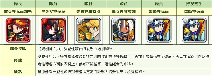 炎属性与光属性混搭的队伍,虽然没有回复型角色,但除了战女神雅典娜之外,所有成员皆属于五星角色,所以攻防以及HP方面的表现都相当地优秀,即使不搭配补师,也有相当高的续战力。再加上所有人都拥有全体攻击型技能,对于战力无法凑足单一属性的玩家来说,这样的混搭方式除了能透过队长技提升攻击力,也可以解决单一属性时会被特定属性克制的问题。