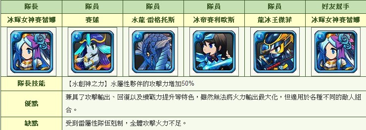 水属性队伍里,考虑到平衡度以及续战力所选搭的成员。除了赛蕾娜之外,赛莲与冰帝赛利欧斯在稀有召唤里出现的机率相当高,甚至于有可能抽到进化完成的四星型态。