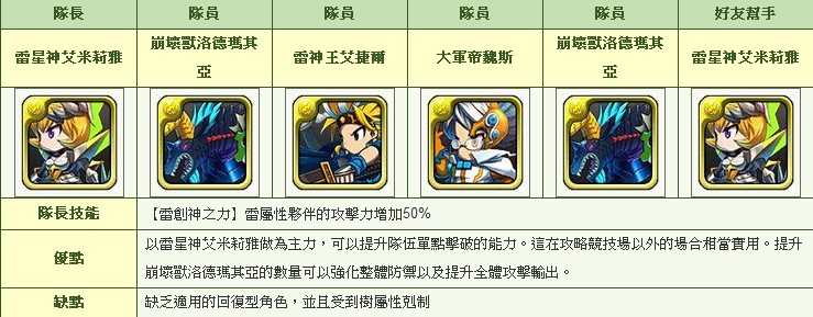 这边不使用雷神王艾捷尔代表雷星神艾米莉雅,主要是因为雷神王艾捷尔因为血量等因素,在战斗上的表现并不稳定。所以队伍的主力除了雷星神艾米莉雅之外,并搭配了高防御力的崩坏兽洛德玛其亚来强化队伍的稳定性。