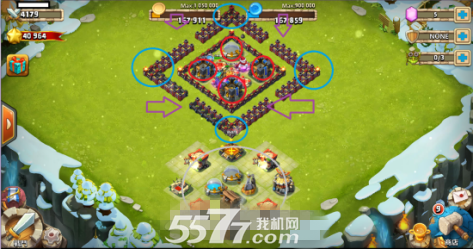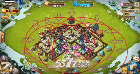 有图可知,不论从哪个角度将会被3座以上的塔攻击(2箭1砲),小兵在此担任前哨消磨兵(-3~-4就会发现其实功能不大,小兵被磨光后还是以塔攻为主),怪物进攻时皆会以兵营以及外围建筑(兵营未被拆除近距会打墙)为目标绕着打(飞行除外),外围皆打完下一个目标是塔,在攻击四方的金库之时(打塔之前),英雄便会出击(远距英雄会在墙内攻击,近距则跳出墙外)不过怪物攻击目标不会是英雄,大多数在此怪物将被歼灭