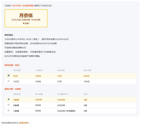 套餐方面,用户可选66/96/126元三个档次的套餐,合约期均为1年。其中选择66元套餐共需花费2219元,包含220元的预存话费,每月返还10元,此外联通每月还会赠送20元话费,也就是说每个月仅套餐费方面自己还要缴纳36元。