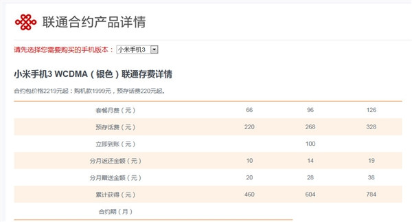 在联通版小米手机3裸机正式开卖之后,小米官网上也开始销售联通合约机了,其价格为2219元起。