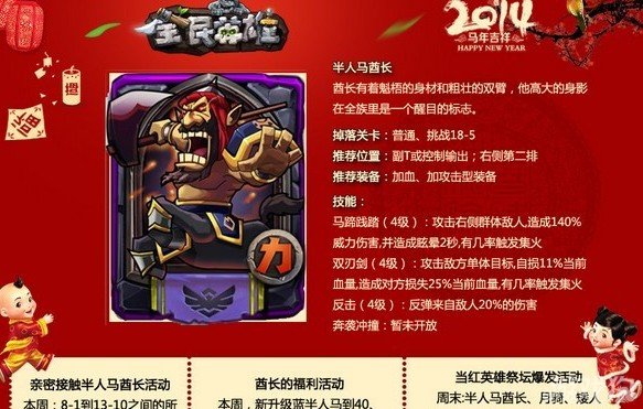 各位全民英雄的玩家,我机小编将要给大家奉上的是最劲爆的马年活动:登陆挑战boss就有机会收获珍稀卡牌“半人马酋长”!此外,官方还会持续发放英雄卡牌、金币、经验绵羊等惊喜好礼,价值不菲!感兴趣的玩家快来看下吧!