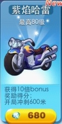 紫焰哈雷:超级拉风的新品摩托车,技能则是为患有“不吃金币就会死症”的玩家量身打造的。骑上这货,你就可以获得10倍的bonus奖励得分,在开局也可以进行600米的无敌冲刺,实乃冲分之必备良车。