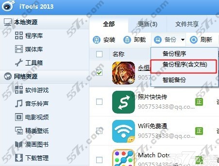 3、点击游戏后方的备份,切记一定要选择【备份程序(含存档)】这一选项;