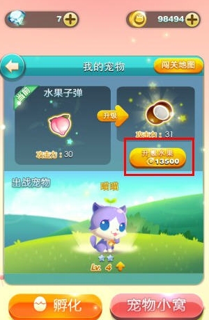 进入“我的宠物”界面,有一个水果子弹的功能,可以升级水果,每升级一次水果子弹,攻击力+1,当然,每升级一次水果子弹相应需要的金币也是递增的,小编已经把水果子弹的攻击力升级到了30哦,所以大家要多攒金币了。