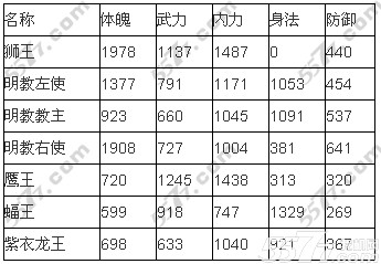 组合效果:明教教主、光明左使、紫衣龙王、鹰王、狮王、蝠王齐上阵,防御+139%。