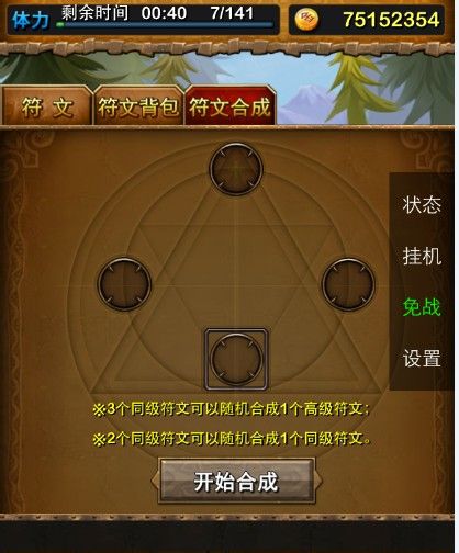 三个同级别符文可以合成高一级的符文,但是比较让人欣慰的是合成几率目前已知是100%(估计以后大师想从符文赚钱的话,这个100%也会随之去掉,想要增加合成率,就要增加浮石的数量)