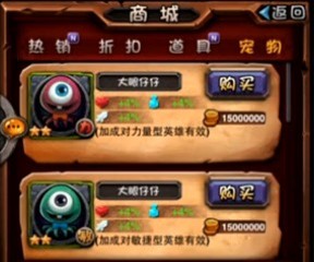 从图片中我们很容易看出,通关金币购买的宠物,需要1500W金币(只对某类型英雄有效)同样从图片中我们可以看出金币购买的宠物会对玩家英雄有4%的加成。