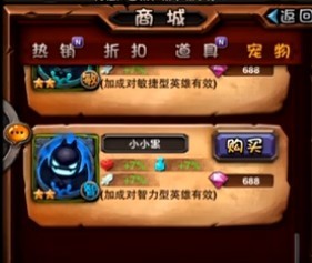 依然从图片中我们可以看到魔钻购买的宠物定价为688(只对某类英雄加成),魔钻购买的宠物属性比金币购买的好的多,对玩家有7%的属性加成。