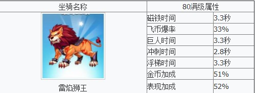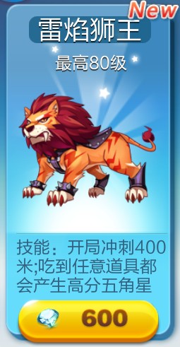 雷焰狮王拥有的技能是:开局400米,吃到任意道具都会产生高会五角星,可在游戏过程中触发更多神秘功能!