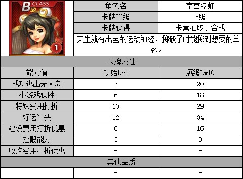 天天富翁的各位玩家们,今天给大家介绍的这个是B级南宫冬虹的满级属性,这个角色的满级属性和之前给大家介绍的世界上最手男人欢迎的女角色相比,稍微差一点,但是也算是有自己的特色!赶紧来看看吧!