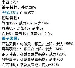 李四的弟子特性,初始属性,弟子缘分成长解析。李四和张三一样,小编看到的第一眼,颇有一点打酱油的感觉,其实呢,他们则都是q传里的乙级弟子,虽然不是特别强劲,但是依然值得我们入手。