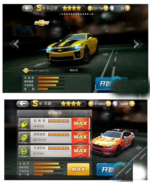 天天飞车男爵S车和科迈罗满级属性对比分析