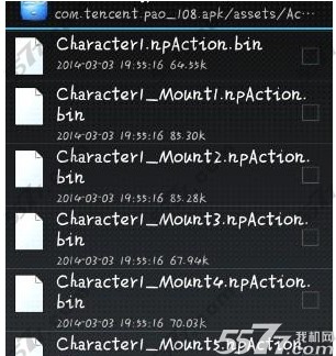1.在RE管理器里面找到官方酷跑的安装包,点击,选择查看,依次进入assets~Action~character,你会发现里面有好多的c开头文件还有M开头的文件,其中c开头的是人物代码,m开头的是坐骑代码!