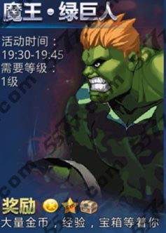 【副本介绍】魔王绿巨人世界boss是一个限时的活动副本,只有在开放时间内玩家才可以进入和绿巨人比拼技能,战胜后就可以得到通关奖励,进入该副本玩家的等级1级就可以。活动时间一般在晚上19点30分——19点45分。玩家在游戏主界面会看见“活动”相关的菜单。在相应的活动时间玩家就可以点击该副本进入,这个活动的参加人数并没有限制,毕竟这是一个世界boss副本,玩家对boss造成的伤害越高,杀死绿巨人后得到的奖励就会越丰厚。玩家如果不小心被绿巨人boss击杀,那么玩家等待15秒就可以复活继续加入到战斗中来。在玩家攻击boss的时候,会有一些特殊的技能供大家使用,帮你来击杀boss。