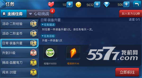 一般一个任务获得1块碎片。比如玩家将自己的装备升星5次,就可以获得一定的经验和橙装碎片