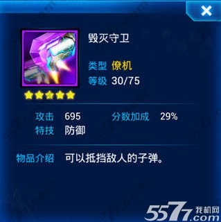 75级的毁灭守卫攻击是2113,只比同等级的电浆炮低72攻击力,数据上属于僚机第二大输出,但由于其过于分散的炮弹,所以对单体敌人时的效果有时还比不上高速炮,玩起来很不爽快,而且出装率也低,令不少玩家不喜欢这装备,不过它有最厉害的防御特技,能消灭大多数攻击。