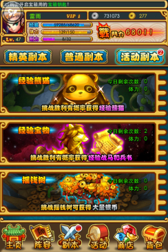 在活动副本里面经验马的上面又多了2只金灿灿的熊猫,这就是我们商城里面热卖的经验熊猫了,跟经验马副本这个经验熊猫副本也要打3轮,不过我机小编发现了一个问题,经验熊猫的伤害超低,但是血量超多,刚开始我还害怕打不过,挂机来打只会浪费一点点时间,每次都可以得到3个经验熊猫这样英雄升级是不是更加快了,废话不多说,上几张图。