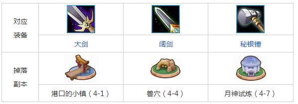 2、另外三种:秘银锤、阔剑、大剑,就确实需要玩家刷普通副本了,这些装备都只有第四章才有掉落,副本名称和对应的装备如下表: