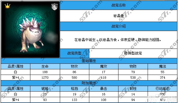 在游戏版本更新后,岩晶兽有变成蓝领的趋势。新增被动技能在竞技场里可以减少夏卡的暴击,比较实用的技能。总的来说还宠物还是很不错的!