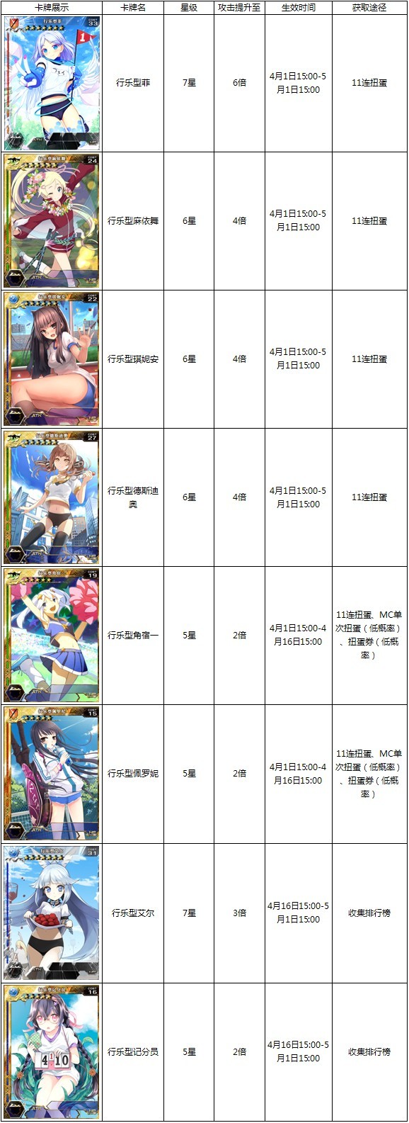 2.4月1日15:00-4月3日,合成卡牌经验值2倍!11连扭蛋获得上述6张新卡概率直升!另外11连扭蛋第十一张卡牌必中一张5星以上限定卡牌(限定列表活动下方已列出)!